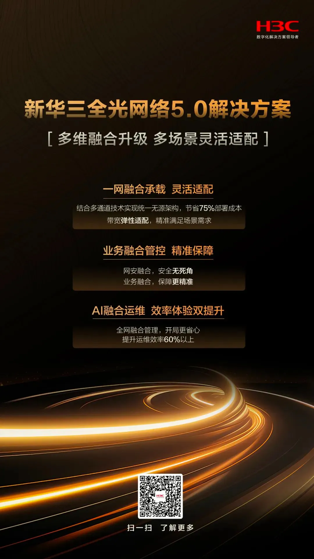 新华三全光网络5.0解决方案坚持“以太光+PON”融合发展路线,创新引入多通道技术,率先实现以太光与PON在无源架构层的一体化融合。方案集成网络安全联动、端到端光切片、智能身份与应用识别等先进能力,构建起光网络与业务系统的高效协同机制。针对细分场景差异化需求,方案提供多元硬件形态与弹性带宽配置,并搭载AI赋能的智能运维平台,助力行业客户打造高密度、超大宽带、高安全、易部署的新一代全光园区网络。